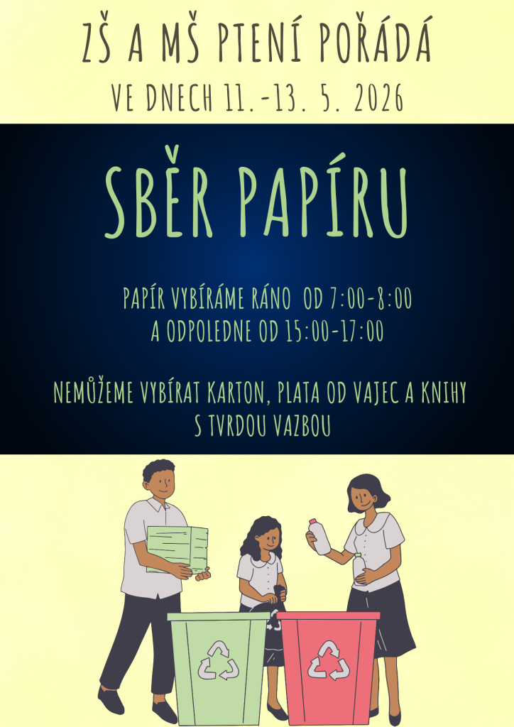 ZŠ a MŠ Ptení pořádá ve dnech 11.–13. května 2026 sběr starého papíru.