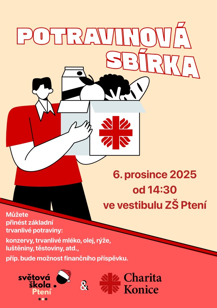 Srdečně Vás zveme k účasti na Potravinové sbírce, která se uskuteční 6. prosince 2025 od 14:30 ve vestibulu ZŠ Ptení při Vánoční besídce.